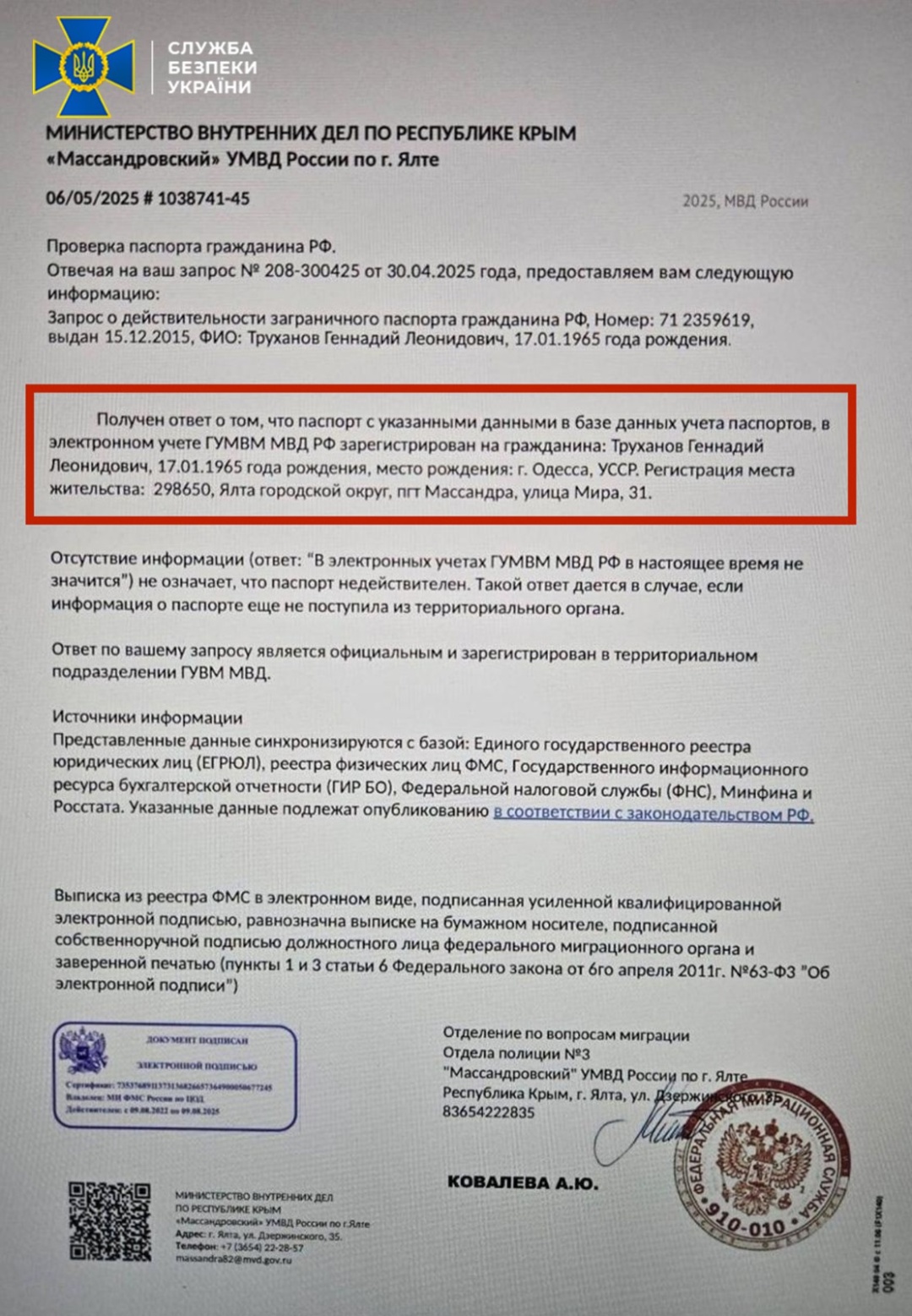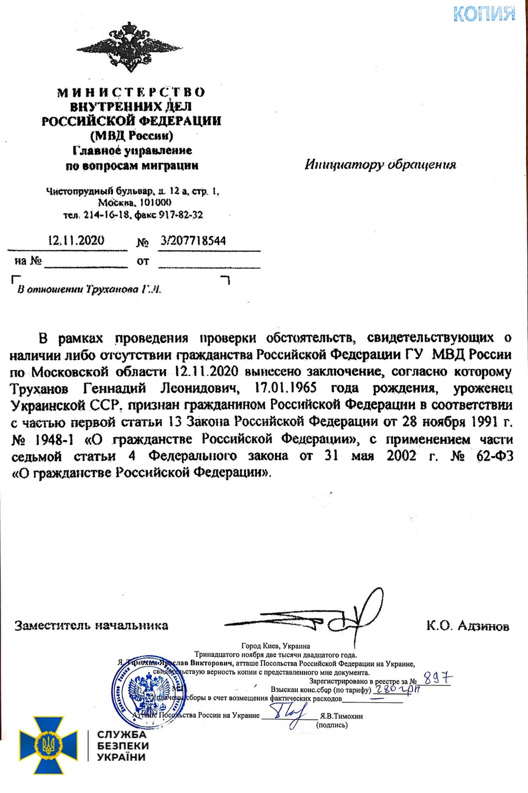 СБУ встановила, що на сьогодні Труханов є громадянином Росії та має її закордонний паспорт, який отримав 15 грудня 2015 року – уже після початку агресії РФ проти України. Документ був виданий на десять років, наразі він чинний.