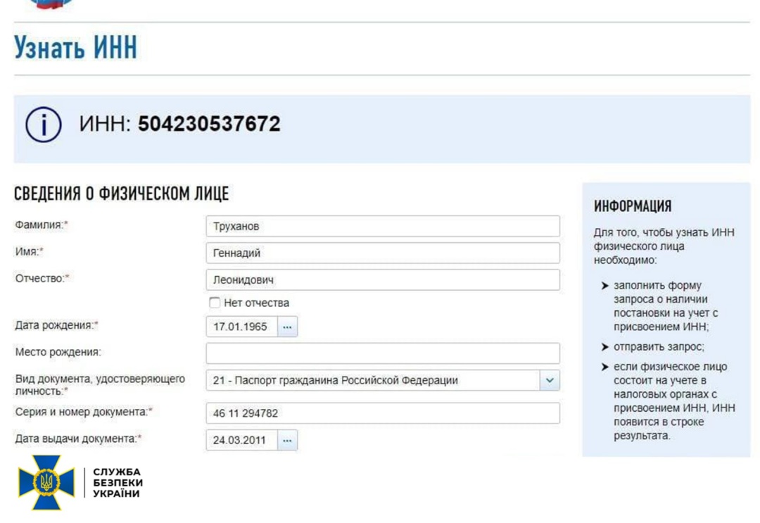 «Таким чином Геннадій Труханов досі залишається громадянином країни-агресора. Він також має ідентифікаційний код, який відображається у базі даних «федеральної податкової служби РФ», – зазначають у спецслужбі.
